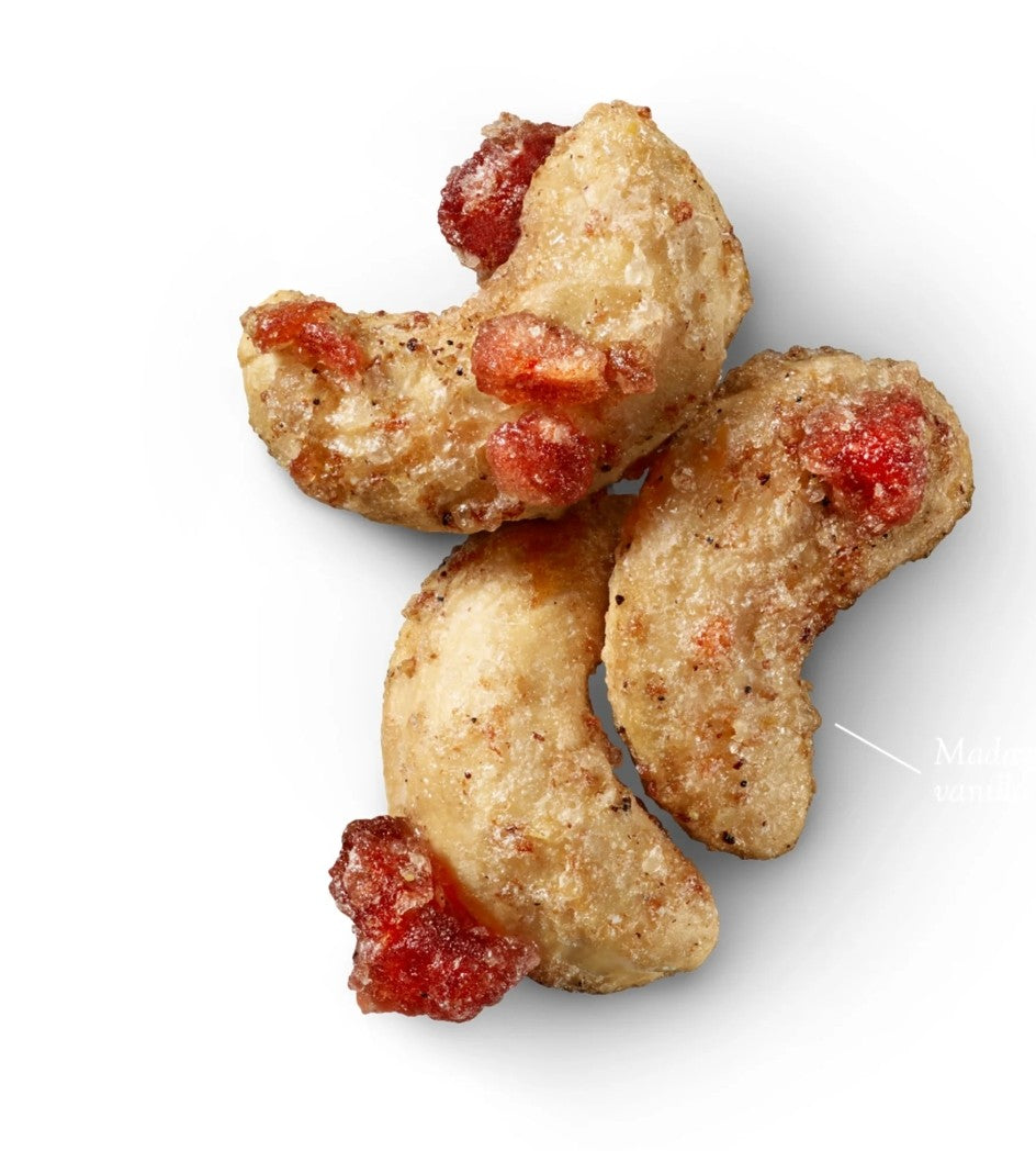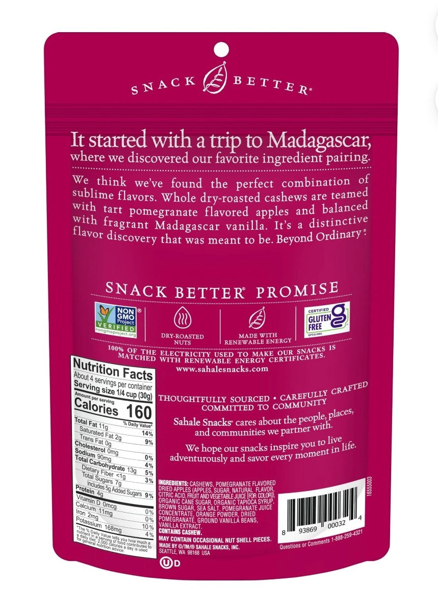 We Think We've Found A Perfect Combination Of Sublime Flavors: Pomegranate, Vanilla, And Cashews. Our Whole Roasted Cashews Are Teamed With Pomegranate And Apple, And Balanced With Pure Vanilla Bean. Our Light Glaze Adds Just The Right Amount Of Sweetness And Flavor.:
